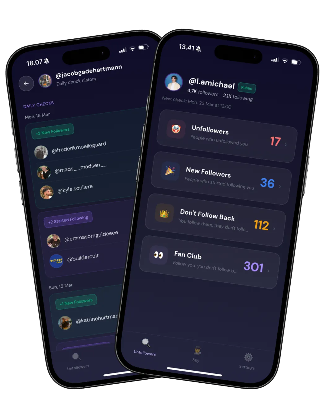 Your unfollowers detected weekly. Their followers and following tracked daily. Push notifications for everything.